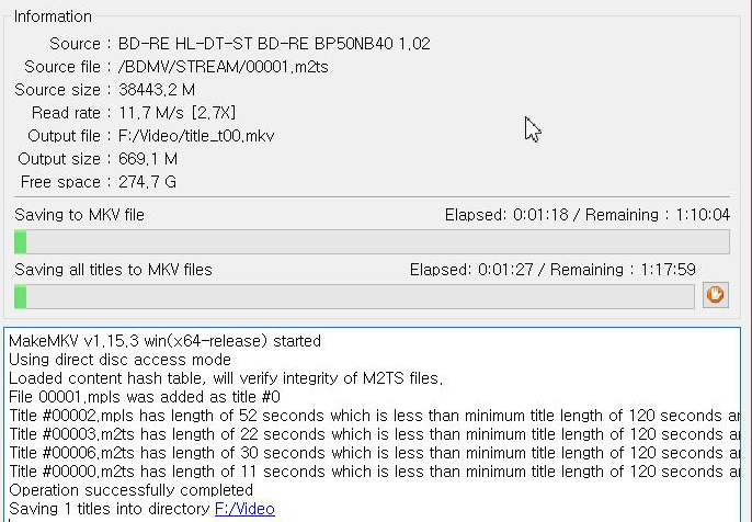 체크를 해주신후, 우측 상단에 있는 Make MKV 버튼을 누르면 블루레이 리핑을 시작합니다.