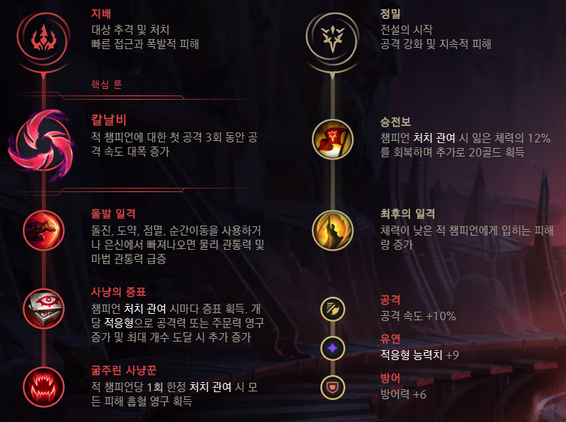 확실한 돌진기가 있기에 돌발 일격을 들어주고, 나머지는 공격속도와 공격력을 올려주는 룬을 들어줍니다.