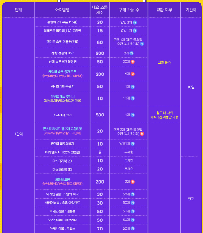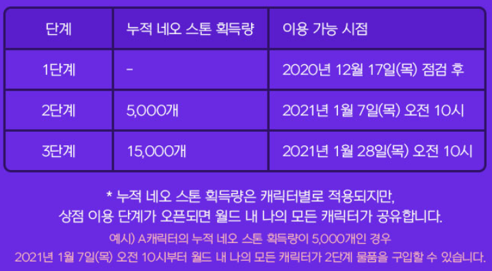 한 캐릭만 누적 네오 스톤만 쌓으면 월드 내 모든 캐릭이 상위 단계 코인샵을 이용할 수 있습니다.