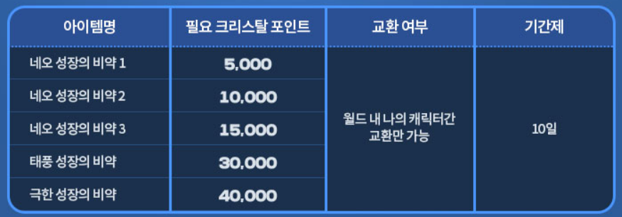 최대 1,500 크리스탈 포인트를 수급할 수 있고, 크리스탈 포인트를 모아서 성장의 비약을 구매할 수 있습니다.