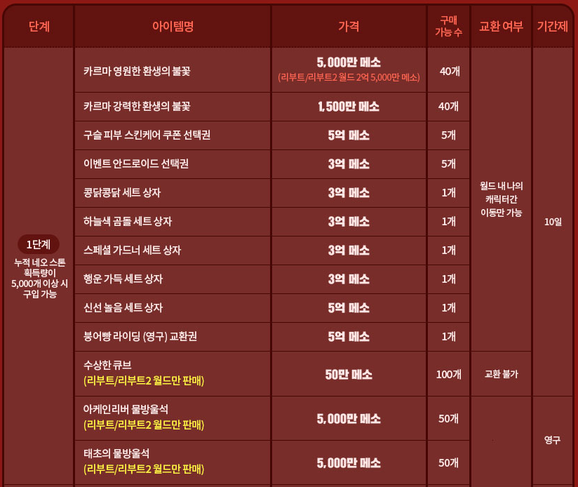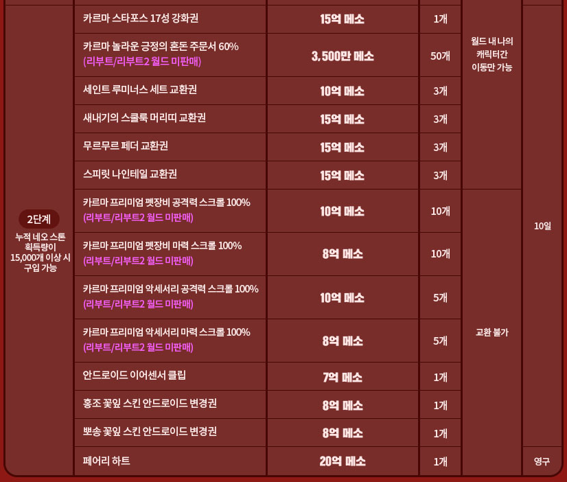 메소를 소모하는 상점인데, 메소가 많이 있다면 좋은 아이템을 구매할 수 있습니다.