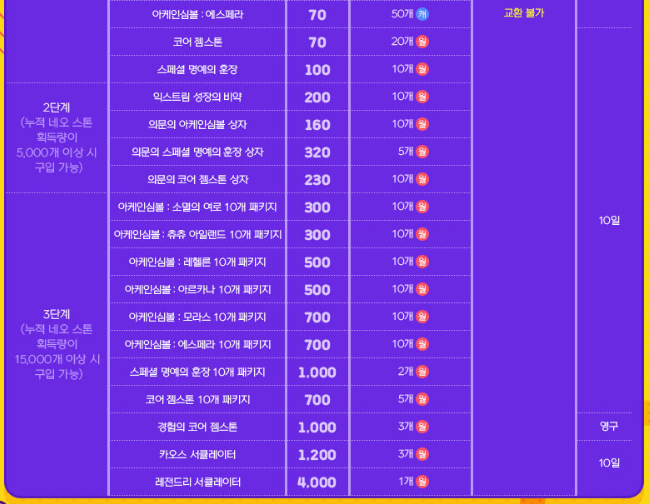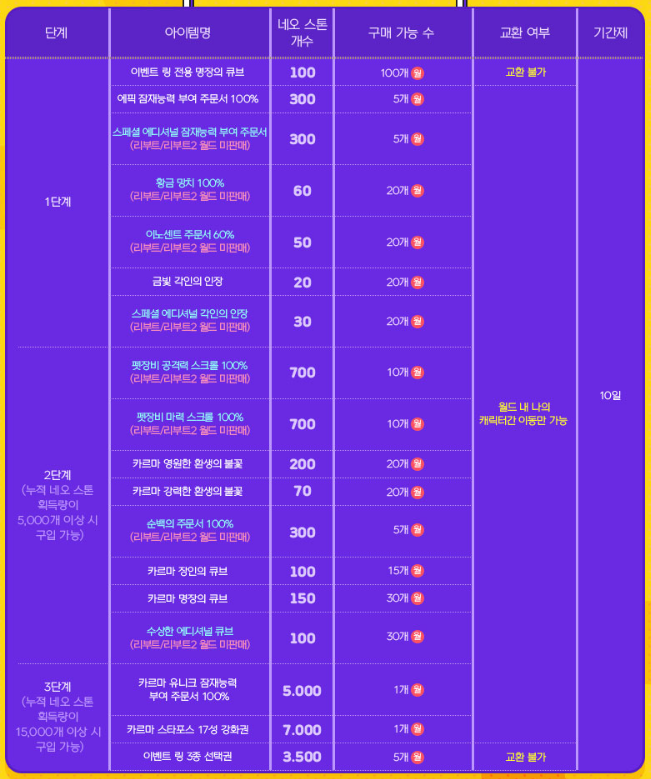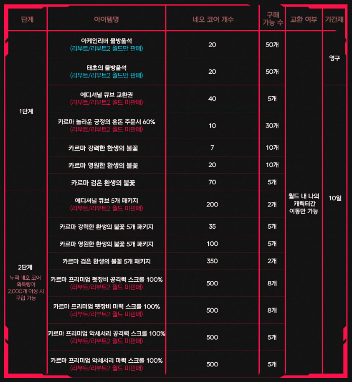 1, 2단계로 나누어져 있고, 2단계는 누적 네오 코어 2,000개 이상 시 구입할 수 있습니다.