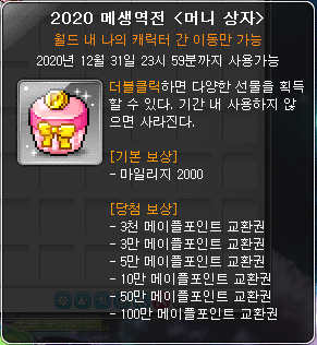 머니 상자에서는 기본적으로 마일리지를 주고, 운이 좋으면 메이플포인트도 얻을 수 있습니다.