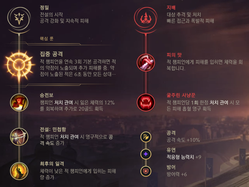 나머지는 공격속도와 데미지, 흡혈 위주 룬을 채용합니다.