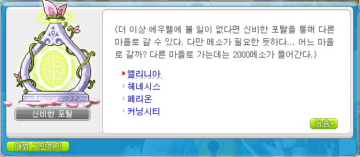엘리니아를 제외한 다른 지역은 2000메소를 사용하고, 쿨타임도 30분이라는 단점도 있으나