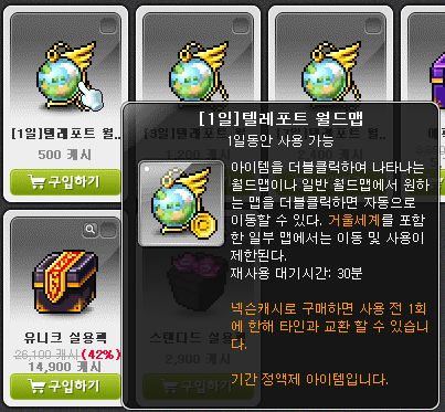 캐시 아이템으로 원하는 지역의 장소까지 콕 집어서 이동할 수 있긴 하지만 쿨타임이 있다는게 단점입니다.